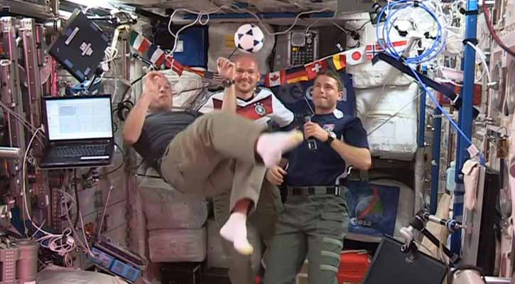 পৃথিবী ছেড়ে মহাশূন্যে অবস্থানরত আন্তর্জাতিক মহাকাশ স্টেশনের বিজ্ঞানীরাও বিশ্বকাপ ফুটবল দেখা থেকে বঞ্চিত থাকতে চাননি। শুধু তাই-ই নয়, তারা ফুটবল খেলেছেন একই সঙ্গে। তবে মাটিতে নয়, মধ্যার্কষণ শক্তিহীন মহাশূন্যে।