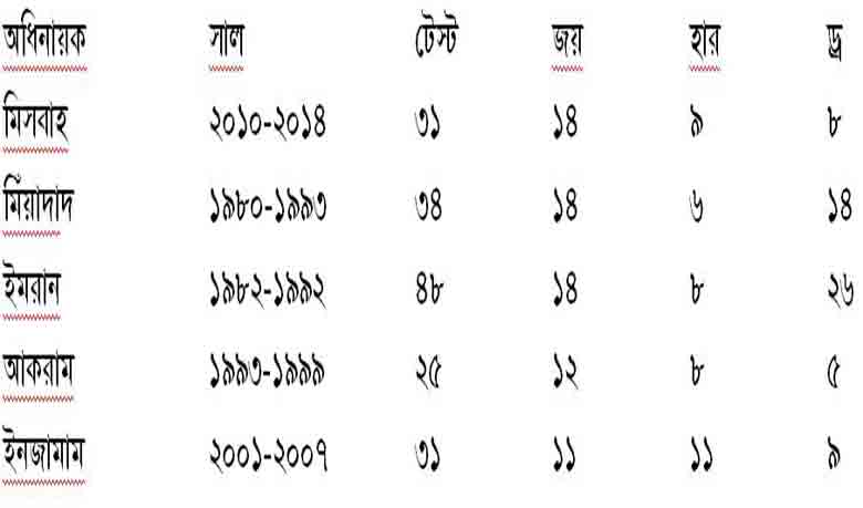 এর আগে ইমরান খান ও জাভেদ মিয়াঁদাদ টেস্ট অধিনায়ক হিসেবে ১৪টি টেস্ট ম্যাচ জিতেছিলেন। মিসবাহও সোমবার সিরিজ জয়ের মধ্যে দিয়ে ১৪টি টেস্ট ম্যাচ জয় তুলে নেন। তবে সাফল্যের হারে ইমরান খান ও জাভেদ মিয়াঁদাদকে পেছনে ফেলে দিয়েছেন মিসবাহ। ইমরান খান ১৪ ম্যাচ জিতেছিলেন ৪৮ ম্যাচে, মিয়াঁদাদকে অপেক্ষায় থাকতে হয়েছিল ৩৪ ম্যাচ পর্যন্ত। আর মিসবাহ তাদের সমান ম্যাচ জিতেছেন ৩১ টেস্টে নেতৃত্ব দিয়ে।