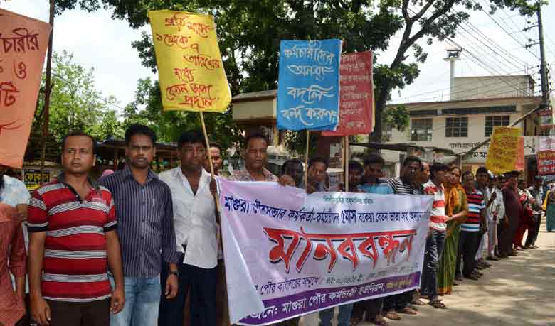 পাঁচ মাসের বকেয়া বেতনসহ সাত দফা দাবিতে মাগুরায় মানববন্ধন ও সমাবেশ করেছে পৌর কর্মচারীরা। আজ দুপুর ১২টায় মাগুরা পৌরসভার সামনে এ মানববন্ধন ও সমাবেশ অনুষ্ঠিত হয়।
