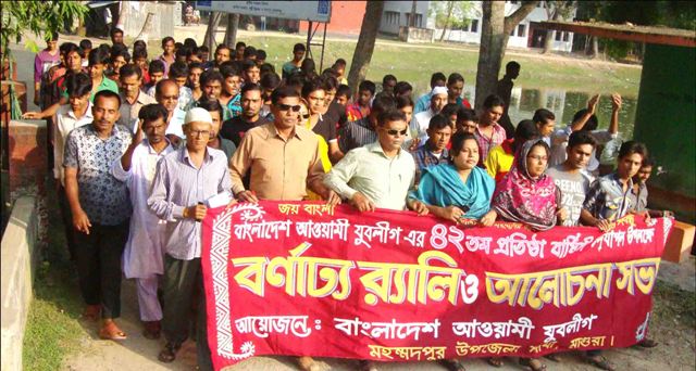 যুবলীগের ৪২তম প্রতিষ্ঠা বার্ষিকী উপলক্ষে মাগুরার মহম্মদপুরে উপজেলা যুবলীগের উদ্যোগে মঙ্গলবার বিকালে বর্ণাঢ্য র্যালি ও আলোচনা সভা অনুষ্ঠিত হয়েছে। এদিন বিকালে উপজেলা পরিষদ এলাকা থেকে বের করা র্যালীটি প্রধান সড়কগুলো পদক্ষিণ শেষে স্থানীয় মুক্তিযোদ্ধা সংসদ কার্যালয়ের সামনে এসে শেষ হয়।