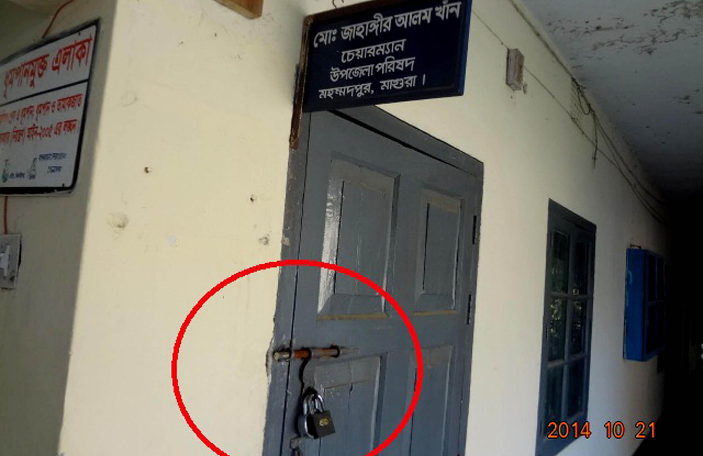 মাগুরার মহম্মদপুর উপজেলা পরিষদের চেয়ারম্যান জাহাঙ্গীর আলম খাঁন বাচ্চুর কার্যালয়ে মঙ্গলবার বিকেলে তালা ঝুলিয়ে দিয়েছেন স্থানীয় আওয়ামীলী ও অঙ্গসংগঠনের নেতাকর্মীরা। এরআগে দুপুরে আওয়ামীলীগের উপজেরা শাখার এক বর্ধিত সভা শেষে নেতাকর্মীরা চেয়ারম্যানের বিরুদ্ধে অনৈতিক কর্মকান্ডের অভিযোগ এনে তার অপসারণের দাবিতে উপজেলা সদরে বিক্ষোভ মিছিল ও স্থানীয় শহীদ রওশন মার্কেটেরে সামনে প্রতিবাদ সমাবেশ করেন। স্থানীয় সরকার বিভাগ মাগুরার উপ-পরিচালক মো: রাহাত আনোয়ার উপজেলা পরিষদ আইনে ব্যবস্থা গ্রহণের জন্য উপজেলা নির্বাহী অফিসার মো: কামরুল হাসানকে নির্দেশ দিয়েছেন।