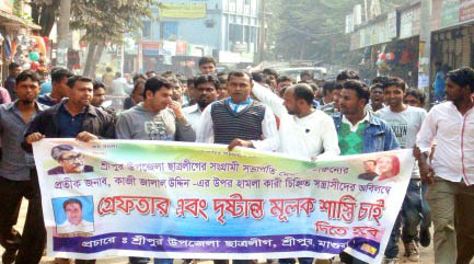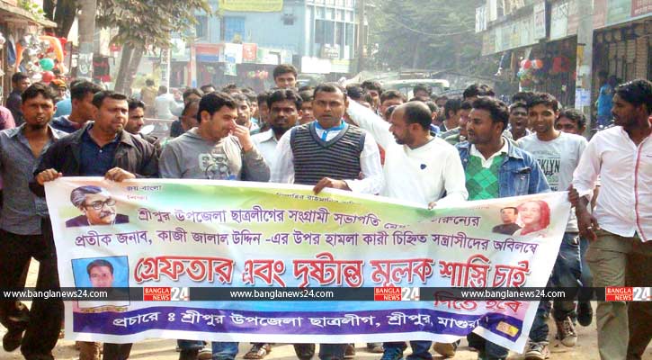 মাগুরার শ্রীপুর উপজেলা ছাত্রলীগ সভাপতি কাজী জালাল উদ্দিনের ওপর হামলার প্রতিবাদে বিক্ষোভ মিছিল ও প্রতিবাদ সভা করেছে শ্রীপুর উপজেলা ছাত্রলীগ।