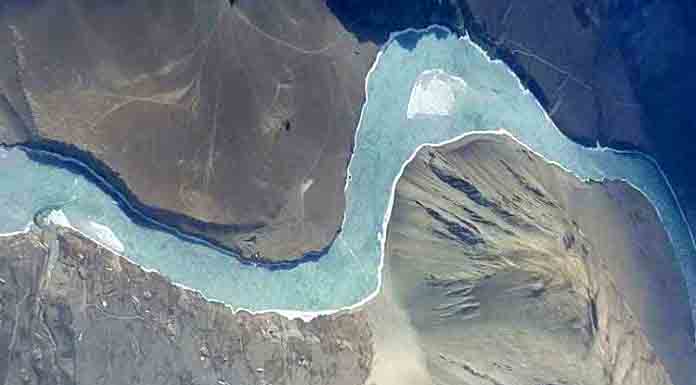 উপর থেকে তোলা ছবিতে ধরা পড়েছে সিন্ধুর থমকে যাওয়া৷ শীতের মরশুমে এটাই পার্বত্য এলাকা দিয়ে বয়ে যাওয়া সিন্ধু নদের ছবি৷ মরশুম কাটলে বরফ গলবে৷ ফের নিজের গতি পাবে সিন্ধু৷ তিব্বত থেকে যাত্রা শুরু করে ভারতের লাদাখ ভূমি পার করে পাকিস্তানে পৌঁছে গিয়েছে সিন্ধু নদ৷
