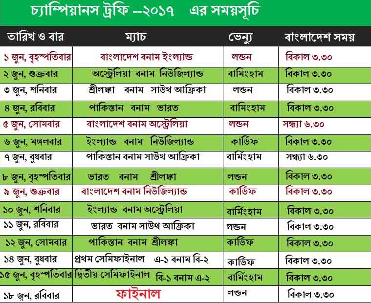 দুদিন পরই শুরু হচ্ছে আইসিসি চ্যাম্পিয়ানস ট্রফি। পয়লা জুন বাংলাদেশ ও ইংল্যান্ড ম্যাচ দিয়ে শুরু হবে এবারের টুর্নামেন্ট। আইসিসি র্যাঙ্কিং এর সেরা আটটি দল এই টুর্নামেন্টে খেলবে। ফলে প্রতিটি ম্যাচেই জমজমাট প্রতিদ্বন্দ্বিতা হবে বলে আশা করছেন ক্রিকেট বিশ্লেষকরা।