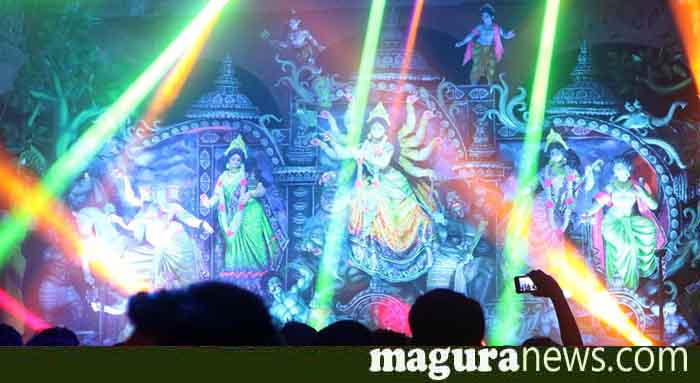 মাগুরা শহরে নিজনান্দুয়ালী, ছানার বটতলা, জামরুলতলা, সাতদোহাপাড়া, নতুন বাজার, বাটিকাডাঙ্গা, পারনান্দুয়ালী, তাতিপাড়াসহ প্রতিটি মন্ডপে রাত বাড়ার সাথে বাড়ছে ভিড়। শহরের প্রতিটি পূজা মন্ডপকে ঘিরে তৈরি হয়েছে দৃষ্টি নন্দন গেট, প্যান্ডেল, তোরণ। অধুনিক লাইটিংয়ের মধ্যমে সাজানো হয়েছে পূজা মন্ডপগুলো। প্রতিটি মন্দিরেই স্থাপন করা হয়েছে নয়নাভিরাম সব প্রতিমা।