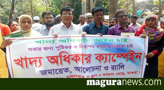 খাদ্য অধিকার আইনের সঠিক প্রয়োগ ও খাদ্য নিরাপত্তা নিশ্চিত করার দাবিতে মাগুরায় র্যালি, মানববন্ধন ও সমাবেশ করেছে বাংলাদেশ খাদ্য অধিকার মাগুরা জেলা কমিটি। আজ শহরের ভায়না মোড়ে এ মানববন্ধন ও সমাবেশ অনুষ্ঠিত হয়।