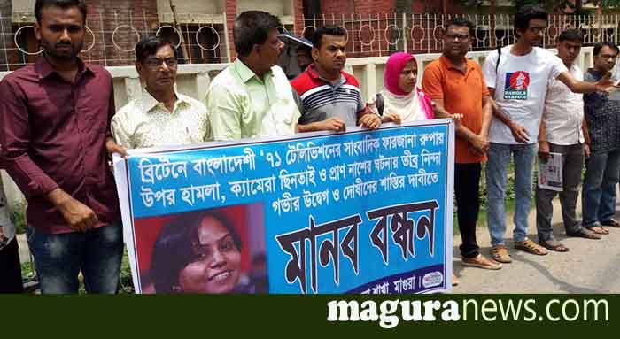 ব্রিটেনে অবস্থানরত বাংলাদেশের ’৭১ টেলিভিশনের বিশেষ প্রতিনিধি ফারজানা রূপার উপর হামলা, ক্যামেরা ছিনতাই ও প্রাণনাশের হুমকি প্রদানের ঘটনার প্রতিবাদে মাগুরায় মানববন্ধন করেছে জেলা টেলিভিশন জার্নালিস্ট এসোসিয়েশন।