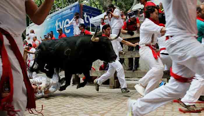 ষাঁড়ের তাড়া। রক্তাক্ত প্রতিবাদ-বিক্ষোভের মধ্যে দিয়ে স্পেনের প্যাম্পলোনায় শুরু হল বিশ্বখ্যাত এই উত্সব। প্যাম্পলোনার রাস্তায় পর্যটকদের তাড়া করবে ষাঁড়ের দল। এটাই উত্সব। আর্নেস্ট হেমিংওয়ের সেই বিখ্যাত উপন্যাস “দ্য সান অলসো রাইসেস’-এর সূত্রে জনপ্রিয় হয়ে ওঠে এই উত্সব। অবলা প্রাণীদের এভাবে উত্সবে সামিল করার প্রতিবাদে নকল রক্ত মেখে, অন্তর্বাস পরে বিক্ষোভ দেখান একদল সমাজকর্মী।