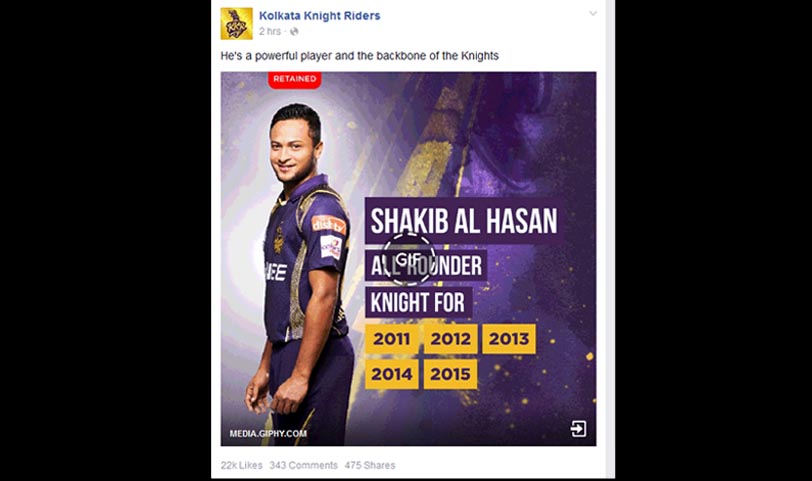 মঙ্গলবার কলকাতা নাইট রাইডার্সের অফিসিয়াল ফ্যান পেইজে সাকিব আল হাসানের বেশকিছু ছবি সম্বলিত একটি জিআইএফ ফরম্যাটের একটি ইমেজ প্রকাশ করেছে। যেখানে সাকিব আল হাসানকে কলকাতা নাইট রাইডার্সের মেরুদণ্ড হিসেবে অভিহিত করা হয়েছে। সেখানে লেখা হয়েছে, ‘হি ইজ এ পাওয়ার প্লেয়ার এন্ড ব্যাকবোন অফ নাইট।’