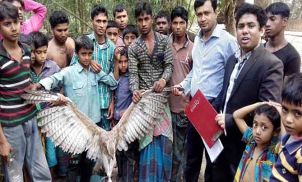 পাখা ছড়ানো অবস্থায় পাখিটির দৈর্ঘ্য চার ফুট। ছাই রঙের পালকের মধ্যে সাদা ডোরাকাটা দাগ রয়েছে। কোন কারণে গুরুতর আহত হয়ে পাখিটি শিশুদের হাতে ধরা পড়ে বলে ধারণা করা হচ্ছে।
