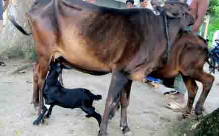 গাভিটির একটি বাছুর রয়েছে। বাছুর ও ছাগল ছানাকে পালাক্রমে দুধ পান করতে দেখা যায়। ছাগল ছানাটি সব সময় গাভির আশপাশেই থাকে।