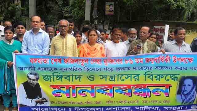 জাতির পিতা বঙ্গবন্ধু শেখ মুজিবুর রহমানের সহধর্মিনী শেখ ফজিলাতুন নেছা মুজিব এর ৮৬তম জন্মদিন উপলক্ষে শালিখায় জঙ্গীবাদ বিরোধী ঐক্যবদ্ধ মাবনবন্ধন অনুষ্ঠিত হয়েছে। এ উপলক্ষে উপজেলা পরিষদ চত্বরে উপস্থিত সুধিজনেরা জঙ্গীবাদের বিরুদ্ধে ঐক্যবদ্ধ বৃহত্তর প্রতিরোধ গড়ে তোলার আহবান জানান। পাশাপাশি আগামী প্রজন্মকে সুনাগরিক হিসেবে গড়ে তুলতে মায়েদের সচেতন হবার আহবান জানান।