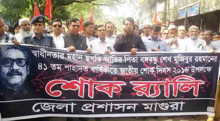 সকালে জেলা প্রশাসনের উদ্যোগে কালেক্টরেট প্রাঙ্গণ থেকে বিশাল শোক র্যালি বের হয়ে শহর প্রদক্ষিণ শেষে নোমানি ময়দানে শহীদ বেদিতে গিয়ে শেষ হয়। শোক র্যালিতে নেতৃত্ব দেন মাগুরা-১ আসনের সংসদ সদস্য মেজর জেনারেল (অব:) এটিএম আব্দুল ওয়াহহাব। উপস্থিত ছিলেন কামরুল লাইলা জলি এমপি, জেলা প্রশাসক মুহ. মাহবুবর রহমান, পুলিশ সুপার একেএম এহসান উল্লাহ, জেলা মুক্তিযোদ্ধা কমান্ডার মোল্লা নবুয়ত আলি, জেলা পরিষদ প্রশাসক এ্যাড. সৈয়দ শরিফুল ইসলাম, জেলা আওয়ামীলীগের সাধারণ সম্পাদক পংঙ্কজ কুন্ডু, এপিপি এ্যাড. রতন কুমার মিত্র, সরকারি কলেজের অধ্যক্ষ প্রফেসর সাহাজ উদ্দিনসহ জেলা আওয়ামীলীগ, ছাত্রলীগ, সরকারি বেসরকারি বিভিন্ন প্রতিষ্ঠান, সংগঠন, স্কুল-কলেজের শিক্ষক শিক্ষার্থীসহ বিভিন্ন শ্রেণী পেশার মানুষ।