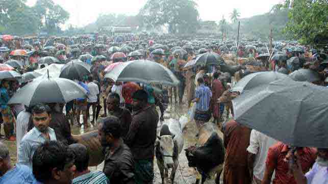 আজ দুপুর একটা, রামনগরের পশুর হাট। চলছে বৃষ্টি। যেদিকে চোখ যায় শুধুই ছাতা আর ছাতা, মানুষ দেখা যাচ্ছেনা। পবিত্র ঈদুল আজহাকে সামনে রেখে শুক্রবার থেকে হাট জমে ওঠার কথা থাকলেও ক্রেতাসংকটের কারণে তা হয়নি। তাই ব্যাপারীরা আশা করে বসেছিলেন শনিবার হয়তো হাট জমবে। কিন্তু দুপুরে বৃষ্টির কারণে শঙ্কায় পড়েছেন ব্যাপারীরা। বৃষ্টি মাথায় নিয়ে সারি সারি গরু-ছাগল নিয়ে ক্রেতার অপেক্ষায় তারা। হাটে নিয়ে আসা পশুকে খাওয়ানো ও বৃষ্টি থেকে রক্ষায় ব্যস্ত তারা। সকাল থেকেই গরুর দর-দাম যাচাই করতে দেখা গেছে সংখ্যক ক্রেতাকে।