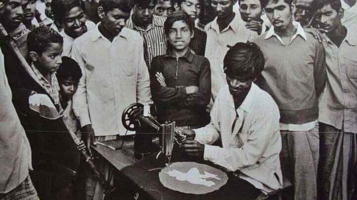 শিবনারায়ণ দাশ। নিজের ডিজাইন করা জাতীয় পতাকা নিজেই সেলাই করছেন- ছবি সংগ্রহ।