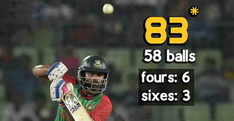 তবে ৩৬ বলে নিজের টি-টোয়েন্টি ক্যারিয়ারের চতুর্থ হাফ সেঞ্চুরি তুলে বাংলাদেশ দলকে সম্মানজনক সংগ্রহ এনে দেন তামিম। টাইগার এই ওপেনার অপরাজিত ছিলেন ৫৮ বলে ৮৩ রানে।