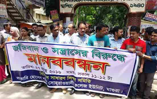 মাগুরায় সন্ত্রাস এবং জঙ্গীবাদের বিরুদ্ধে বিসিএস সাধারণ শিক্ষা সমিতি আজ দুপুরে শহরে মানববন্ধন ও সমাবেশ করেছে।
