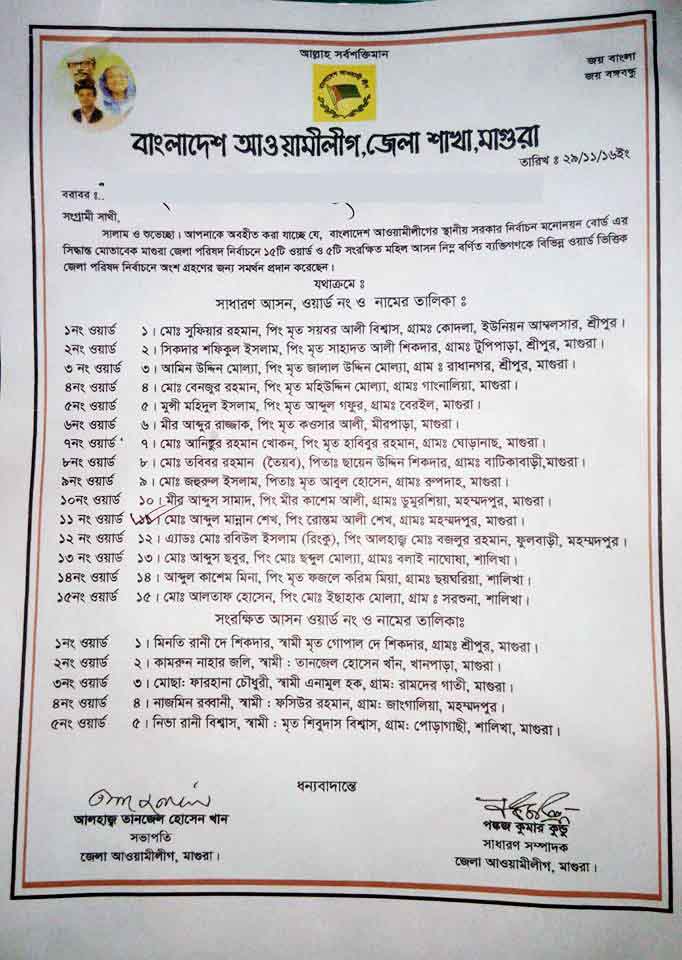 জেলা পরিষদে মাগুরা জেলা আ’লীগ সমর্থিত প্রার্থীদের তালিকাPosted on November 30, 2016November 30, 2016 by Magura News মাগুরানিউজ.কমঃ বিশেষ প্রতিবেদক- জেলা পরিষদ নির্বাচনে মাগুরা জেলা আওয়ামী লীগ সমর্থীত প্রার্থীদের নামের তালিকা প্রকাশ করেছে দলটি। জেলা সভাপতি আলহ্বাজ তানজেল হোসেন খান ও সম্পাদক পংকজ কুমার কুন্ডু সাক্ষরিত তালিকা- পোষ্ট শেয়ার করুনFacebookTwitterLinkedInEmailPrintLike this:Like Loading...