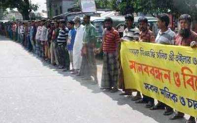 মানববন্ধনে কয়েকশ মাহেন্দ্র ও থ্রি-হুইলারের চালক ও মালিকরা অংশ নেন।