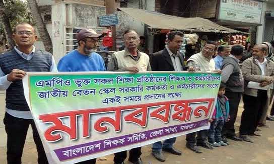এমপিও ভুক্ত সকল শিক্ষা প্রতিষ্ঠানের শিক্ষক-কর্মচারীদের জাতীয় বেতন স্কেল সরকারী কর্মকর্তা কর্মচারীদের সাথে একই সময়ে প্রদানের দাবীতে আজ সোমবার সকালে মানববন্ধন করেছে বাংলাদেশ শিক্ষক সমিতি মাগুরা জেলা শাখা।