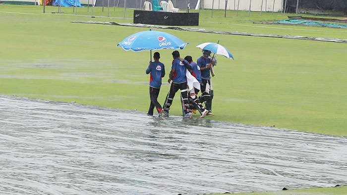 ২৩ ওভার খেলা হতে না হতেই নামে বৃষ্টি। দ্রুত ব্যাটসম্যান এবং ফিল্ডার চলে যান ড্রেসিংরুমে। তৎপরতা শুরু হয়ে যায় গ্রাউন্ডসম্যানদের। তারা গিয়ে ত্রিপল দিয়ে ঢেকে দেন মাঠের উইকেট। ৪.৩৫ মিনিটে শুরু হয় বৃষ্টি।
