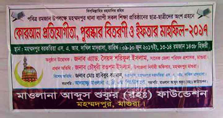 মাগুরা মহম্মদপুরে মাওলানা আঃ শুকুর (রহঃ) ফাউন্ডেশনের আয়োজনে মহম্মদপুর বরকতিয়া এসএআর দাখিল মাদ্রাসায় পবিত্র রমজান মাস উপলক্ষে উপজেলার সকল শিক্ষা প্রতিষ্ঠানের ছাত্র-ছাত্রীদের অংশগ্রহণন দুইদিন ব্যাপী কোরআন প্রতিযোগিতার আয়োজন করা হয়েছে।