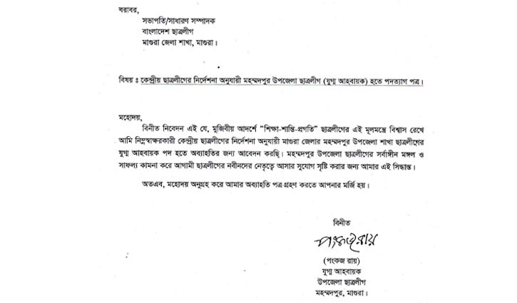 বাংলাদেশ ছাত্রলীগ কেন্দ্রীয় কমিটির সিন্ধান্ত অর্থাৎ সম্মান জানিয়ে ও নতুন নেতৃত্বকে সুযোগ করে দেওয়ার লক্ষে পদত্যাগ করলেন মাগুরার মহম্মদপুর উপজেলা ছাত্রলীগের আহবায়ক কমিটির যুগ্ম আহবায়ক পংকজ রায়।