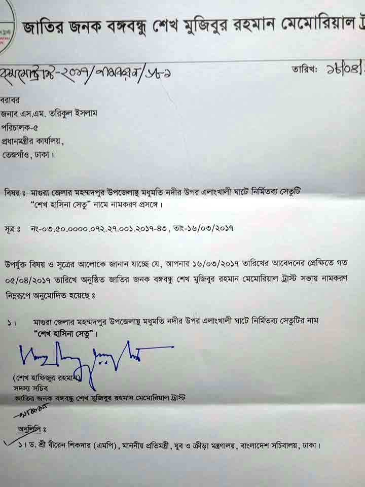 মাগুরার মহম্মদপুরে মধুমতি নদীর এলাংখালি ঘাটে নির্মিতব্য সেতুটির নামকরনের অনুমোদন দেয়া হয়েছে। সেতুটির