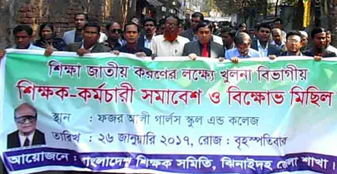 শিক্ষা জাতীয়করণের দাবীতে ঝিনাইদহে মাগুরাসহ ৬ জেলার খুলনা বিভাগীয় শিক্ষক-কর্মচারী সমাবেশ ও বিক্ষোভ মিছিল অনুষ্ঠিত হয়েছে। বাংলাদেশ শিক্ষক সমিতির আয়োজনে বৃহস্পতিবার বিকেলে ঝিনাইদহ শহরের ফজর আলী গার্লস স্কুল এন্ড কলেজ মাঠে এ সমাবেশে সভাপতিত্ব করেন বাংলাদেশ শিক্ষক সমিতি কেন্দ্রীয় কমিটির সহ-সভাপতি এস এম আবু বক্কর।