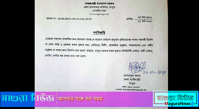 করোনাভাইরাসের প্রাদুর্ভাব প্রতিরোধে মাগুরা জেলা প্রশাসন আজ ১৯মার্চ বিশেষ গণবিজ্ঞপ্তি জারি করেছে।