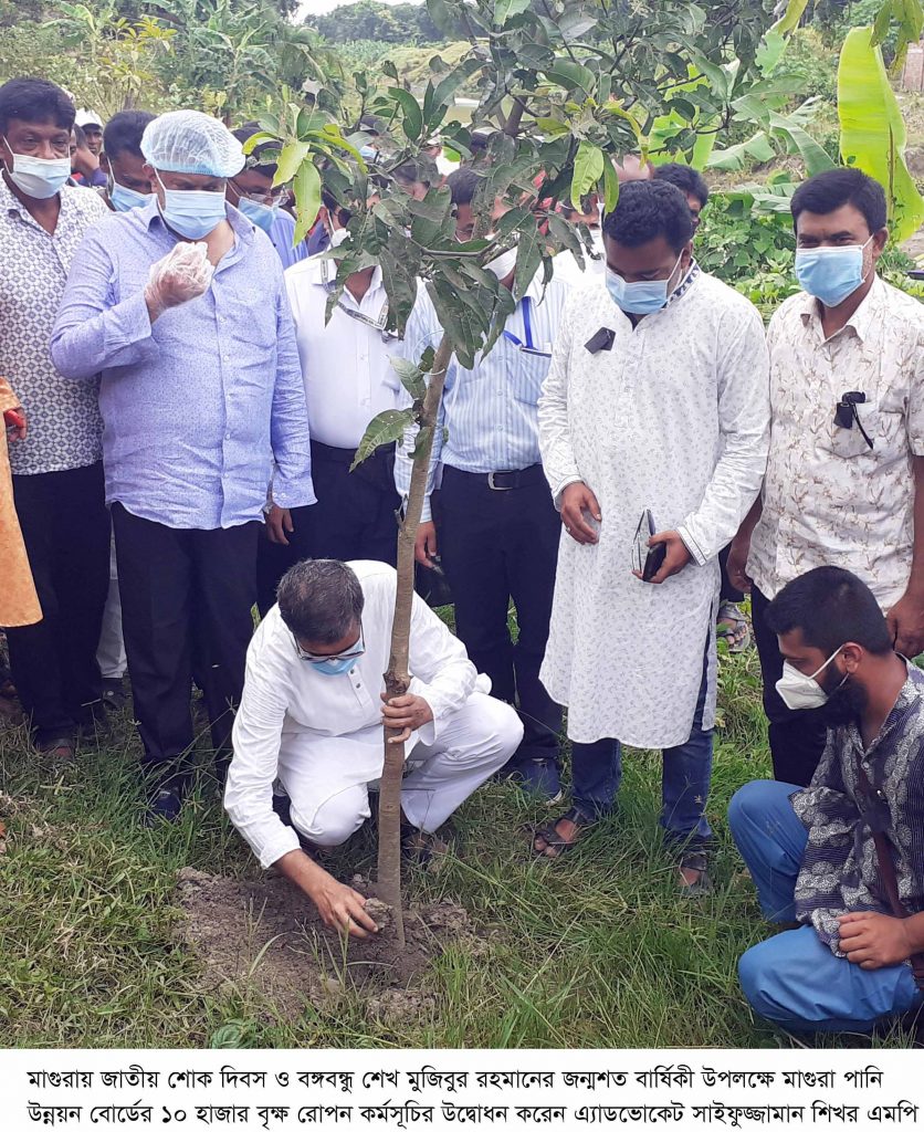 মাগুরা প্রতিনিধি : মাগুরা পানি উন্নয়ন বোর্ড জাতীয় শোক দিবস ও বঙ্গবন্ধুর জন্মশত বার্ষিকী উপলক্ষ্যে আজ বৃহস্পতিবার দুপুরে হাওড় খালীর খালে বৃক্ষ রোপন কর্মসূচির উদ্বোধন করেছেন। এ্যাডভোকেট সাইফুজ্জামান শিখর এমপি প্রধান অতিথি হিসেবে উপস্থিত ছিলেন। পানি উন্নয়ন বোর্ডের নির্বাহী প্রকৌশলী সরোয়ার জাহান সুজনের সভাপতিত্বে অন্যান্যের মধ্যে উপস্থিত ছিলেন পৌর মেয়র খুরশীদ হায়দার টুটুল, সদর উপজেলা ভাইস চেয়ারম্যান শেখ রেজাউল ইসলাম, যুবলীগ নেতা আরিফুর রহমান রনক, আসিফ আল আছাদ মেলিন, জেলা ছাত্রলীগের সভাপতি মীর মেহেদী হাসান রুবেল প্রমুখ। মাগুরা পানি উন্নয়ন বোর্ড জেলার বিভিন্ন খালপাড় দিয়ে ১০ হাজার বৃক্ষ রোপন করবেন বলে জানানো হয়।