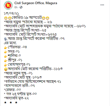 আজ মাগুরায় ২৫ জনের এর নমুনা পরীক্ষা করা হয়েছে, তাদের মধ্যে ৭ জনের করোনা শনাক্ত। এর মধ্যে পৌরসভায় ৪ জন। এ অবস্থায় জেলা প্রশাসন সকলকে কঠোরভাবে স্বাস্থ্যবিধি মেনে চলার নির্দেশনা দিয়েছেন।
