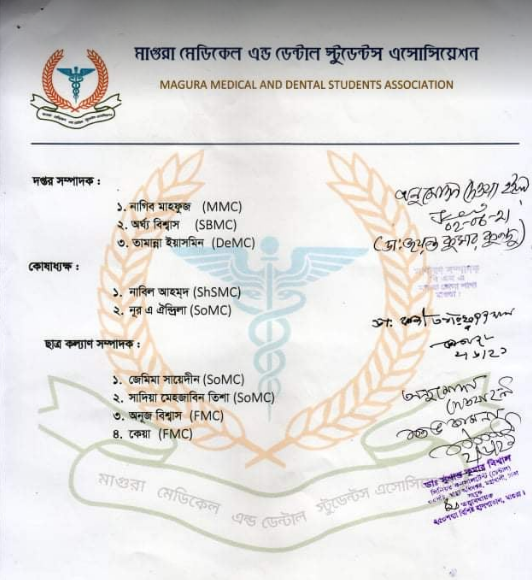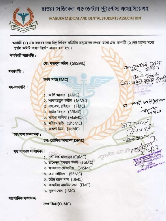 এছাড়াও সহ-সভাপতি হয়েছেন আর্লি আক্তার, শাফায়েতুল করিম, অতসী মিত্র,মাইশা মালিহা, এস এম রাইহান, সার্থক বিশ্বাস, মরিয়ম মুক্তি। সহ-সম্পাদক – তৌফিক আহমেদ, তমা ভৌমিক, রাশেদুল ইসলাম সজল, ফারজানা ফেরদৌস, রুদ্র রঞ্জন দাস, রুকাইয়া নাসরিন তমা, সুজন ঘোষ। সাংগঠনিক সম্পাদক- শেখ কিরণ। দপ্তর সম্পাদক নাগিব মাহফুজ, অর্ঘ্য বিশ্বাস, তামান্না ইয়াসমিন। কোষাধক্ষ্য -নাবিল আহমেদ, নূরী ঐন্দ্রিলা। ছাত্রকল্যাণ সম্পাদক- জেমিমা সায়েদিন, সাদিয়া মেহজাবীন তিশা, অনুজ বিশ্বাস, কেয়া। প্রসঙ্গত উল্লেখ্য ২০১৭ সালে মাগুরার সকল মেডিকেল ও ডেন্টাল পড়ুয়া শিক্ষার্থীদের নিয়ে সংগঠনটির পথ চলা শুরু।
