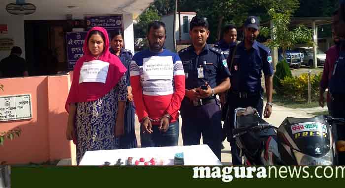 মাগুরা শহরতলীর আদর্শ কলেজ সংলগ্ন এলাকায় একটি ভাড়াবাসা থেকে ৫৫০ পিস ইয়াবাসহ মাহামুদুর হাসান ও রাবেয়া বেগম নামে দুইজনকে আটক করেছে পুলিশ। সোমবার দুপুর ১২ টার দিকে তাদের আটক করা হয়। এ সময় উদ্ধার করা হয় ধারালো অস্ত্র, নগদ অর্থ ও প্রেস স্টিকার লাগানো মোটরসাইকেল।