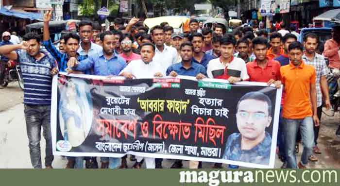 বাংলাদেশ প্রকৌশল বিশ্ববিদ্যালয়ের মেধাবি ছাত্র আবরার ফাহাদ হত্যাকাণ্ডের প্রতিবাদে মাগুরায় বাংলাদেশ ছাত্রলীগ (জাসদ) শহরে বিক্ষোভ মিছিল ও সমাবেশ করেছে।