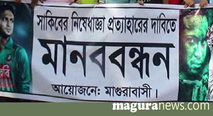 বিশ্বসেরা আলরাউন্ডার সাকিব আল হাসানকে এক বছর সব ধরনের ক্রিকেট থেকে নিষিদ্ধ করার প্রতিবাদে মাগুরায় মানববন্ধন ও বিক্ষোভ মিছিল হয়েছে। আজ বুধবার সকাল ১১টায় মাগুরা সরকারী কলেজের সামনে আমরা মাগুরাবাসীর ব্যানারে এ মানববন্ধন ও বিক্ষোভ অনুষ্ঠিত হয়।