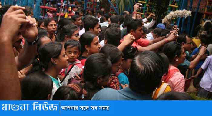 ঠাকুর দেখতে প্যান্ডেলে প্যান্ডেলে মানুষের ভিড়। যে দিকে তাকানো যাচ্ছে, শুধুই কালো মাথার সারি। দলবেধে চলছে পূজা পরিদর্শন। শহরে যান চলাচল বন্ধ রয়েছে।