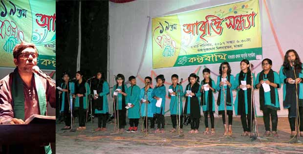 অনুষ্ঠানের শুরুতেই পশ্চিমবঙ্গের খ্যাতিমান আবৃত্তি শিল্পী সৌরেন চট্টোপধ্যায়কে উত্তোরীয় পরিয়ে দেন মাগুরার প্রবীণ শিক্ষাবিদ ও ভাষা সৈনিক খান জিয়াউল হক। এরপর সন্ধ্যা ৭ টা থেকে রাত ১০ টা পর্যন্ত একটানা চলে মনোজ্ঞ আবৃত্তি অনুষ্ঠান। সংগঠনটির সাধারণ বিভাগের শিল্পীদের পরিবেশনায় একের পর এক চলে একক ও দ্বৈত আবৃত্তি পরিবেশনা।