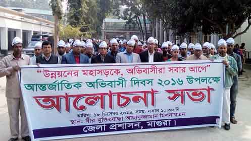 ‘উন্নয়নের মহাসড়কে, অভিবাসীরা সবার আগে’ এই শ্লোগানে আজ মাগুরাতেও পালিত হলো আন্তর্জাতিক অভিবাসী দিবস।দিবসটি পালনে জেলা প্রশাসন ও জনশক্তি অফিসের যৌথ উদ্যোগে এদিন সকালে একটি বর্ণাঢ্য র্যালী বের হয়ে শহরের প্রধান সড়ক প্রদক্ষিণ করে। পরে বীর মুক্তিযোদ্ধা আছাদুজ্জামান মিলনায়তনে অনুষ্ঠিত হয় আলোচনা সভা।