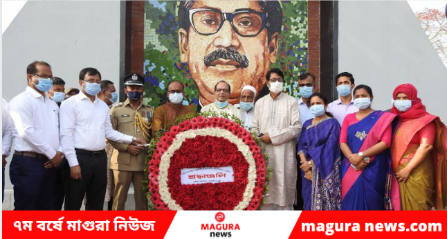 মাগুরা স্টেডিয়ামের সামনে বঙ্গবন্ধুর প্রতিকৃতিতে পুষ্পস্তবক অর্পন ও দোয়া মাহফিলের মধ্যে দিয়ে মুজিব শতবর্ষ পালিত হয়েছে। সকাল ৯ টায় জেলা প্রশাসক ড. আশরাফুল আলম ও পুলিশ সুপার জহিরুল ইসলাম রাষ্ট্রীয়ভাবে বঙ্গবন্ধুর প্রতিকৃতিত্বে পুষ্পস্তবক অপর্ন করে শ্রদ্ধা নিবেদন করেন।