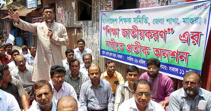 শিক্ষা জাতীয়করণের দাবিতে বুধবার মাগুরায় বেসরকারি বিভিন্ন মাধ্যমিক বিদ্যালয়ের শিক্ষকরা প্রতীকী অনশন ও সমাবেশ করেছে।