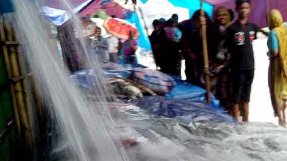 সরেজমিনে দেখা যায়, খোলা আকাশের নিচে জমে ওঠে অল্প আয়ের মানুষের বিপণিবিতান। বৃষ্টির পানির জলাবদ্ধতায় ব্যবসায়ীদের নির্ধারিত স্থানে তাদের মালামাল পলিথিনে মুড়িয়ে রাখা হয়েছে। ক্রেতারাও ভীর করছে না। ফলে বেচা কেনা বন্ধ রয়েছে।