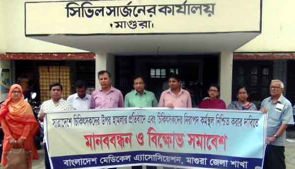 আজ রবিবার দুপুরে এ মানববন্ধনের আয়োজন করে। মানববন্ধন শেষে সমাবেশে বক্তব্য রাখেন বিএমএ মাগুরা জেলা শাখার সাধারণ সম্পাদক ডা. জয়ন্ত কুমার কুণ্ডু।