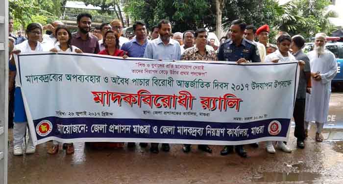 “শিশু ও যুবাদের মনোযোগ দেয়াই তাদের নিরাপদ বেড়ে উঠার প্রথম পদক্ষেপ”এই প্রতিপাদ্যে আজ মাগুরাতেও মাদকের বিরুদ্ধে সরকারি-বেসরকারি উদ্যোগে নানা কর্মসূচি পালন করা হচ্ছে। ছবিতে মাদকবিরোধী শোভাযাত্রা।