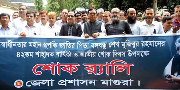 সকাল ১০ টায় এ উপলক্ষে জেলা প্রশাসনের আয়োজনে কালেক্টরেট প্রাঙ্গন থেকে শোক র্যালী শহরের প্রধান প্রধান সড়ক প্রদক্ষিন করে নোমানী ময়দানে গিয়ে শেষ হয়।সকাল ১০টায় মাগুরা জেলা প্রশাসক অফিস চত্বর থেকে নোমানী ময়দান পর্যন্ত শোক র্যালী বের করা হয়। র্যালীতে সরকারী কর্মকর্তা, জনপ্রতিনিধি, রাজনৈতিক নেতৃবৃন্দসহ বিভিন্ন শ্রেনীপেশার মানুষ অংশ নেন।