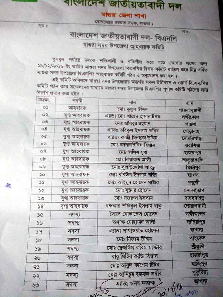 মাগুরা সদর উপজেলা বিএনপি’র আহবায়ক কমিটি ঘোষনাPosted on December 20, 2016December 20, 2016 by Magura News মাগুরানিউজ.কমঃ বিশেষ প্রতিবেদক- এক বিজ্ঞপ্তিতে বাংলাদেশ জাতীয়তাবাদী দল মাগুরা জেলা শাখার মাগুরা সদর উপজেলার আহবায়ক কমিটি গতকাল প্রকাশ করা হয়েছে। মাগুরা জেলা বিএনপির আহবায়ক সৈয়দ আলী করিম কমিটির বিষয়টি নিশ্চিত করেছেন। পোষ্ট শেয়ার করুনFacebookTwitterLinkedInEmailPrintLike this:Like Loading...