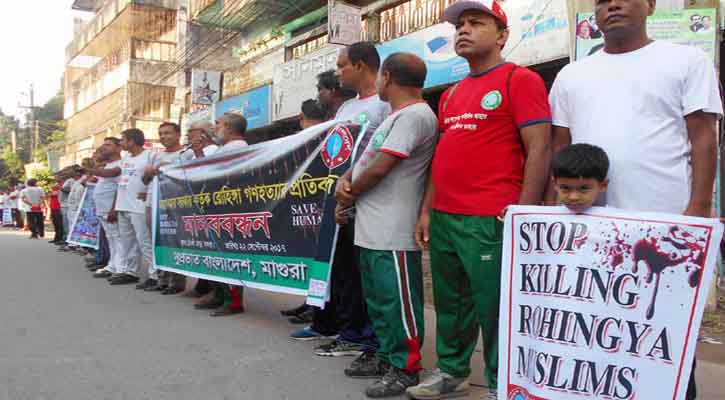 মিয়ানমারে রোহিঙ্গা জনগোষ্ঠির উপর গণহত্যা, ধর্ষণ, অগ্নিসংযোগ ও অমানবিক নির্যাতনের প্রতিবাদে মাগুরায় মানববন্ধন ও সমাবেশ করেছে সুপ্রভাত বাংলাদেশ নামে একটি সামাজিক সংগঠন।