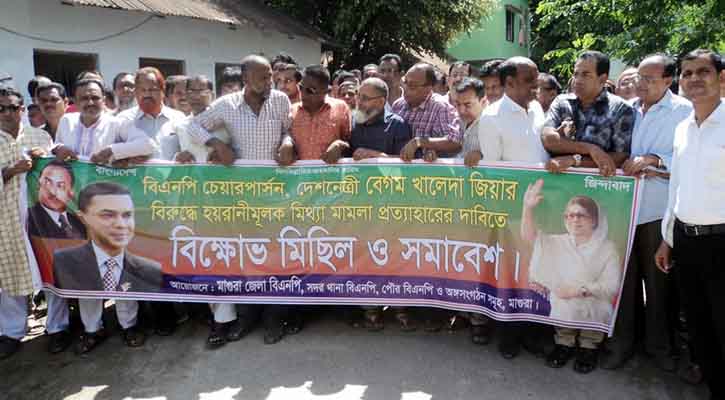 বিএনপির চেয়ারপারসন বেগম খালেদা জিয়ার বিরুদ্ধে দায়েরকৃত মিথ্যা মামলা প্রত্যাহারের দাবিতে বিক্ষোভ মিছিল সমাবেশ করেছে মাগুরা জেলা বিএনপি ও তার অঙ্গ-সহযোগী সংগঠনগুলো।