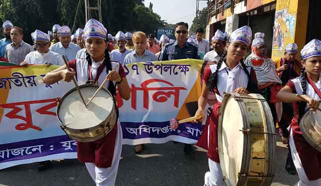ছবিতে মাগুরা শহরে জাতীয় যুব দিবসের বণ্যাঢ্য শোভাযাত্রা।