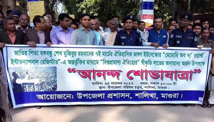 জাতির জনক বঙ্গবন্ধু শেখ মুজিবুর রহমানের ঐতিহাসিক ৭ই মার্চের ভাষণকে দেওয়া ইউনেস্কোর স্বীকৃতি উদযাপনে শালিখায় আনন্দ শোভাযাত্রা অনুষ্ঠিত হয়েছে।
